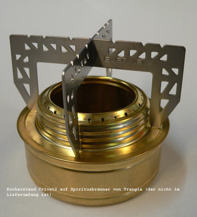 In den Detailbildern sehen Sie den Trivet2 auf einem Trangia Brenner (den wir deshalb als sehr guten Spiritusbrenner empfehlen, weil er die Möglichkeit zur Flammeinstellung hat, und weil er eine komplette Brennerladung, ausreichend für ca. 30 Minuten Kochen, beim Transport beinhalten kann. Kein Rumgefummel mit überschüssigem Brennstoff nach einem Kochvorgang), auch im Vergleich zum bisherigen Trivet. Beim bisherigen Trivet war das Trivet-Kreuz so tief, dass die Zentralflamme des Trangia-Brenners länger brauchte, um mit dem von Spirituskochern bekannten „Plopp“ Turbomässig durch zu starten.