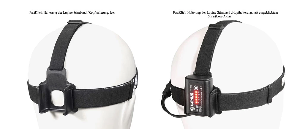 Akkuhalterung: 2.0 Ah FastClick, mit FastClick-System am Helmhalter, mit FastClick-System am Stirnband