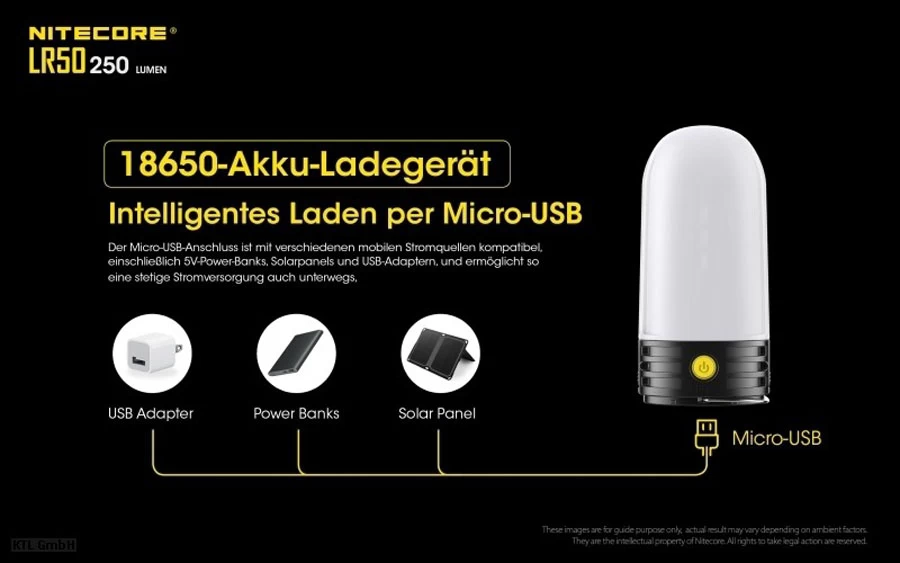 - Akkus können – von einer Powerbank, einem Solarmodul oder vom Netz mit USB-Adapter) in der Lampe aufgeladen werden