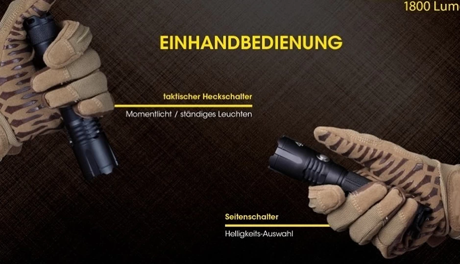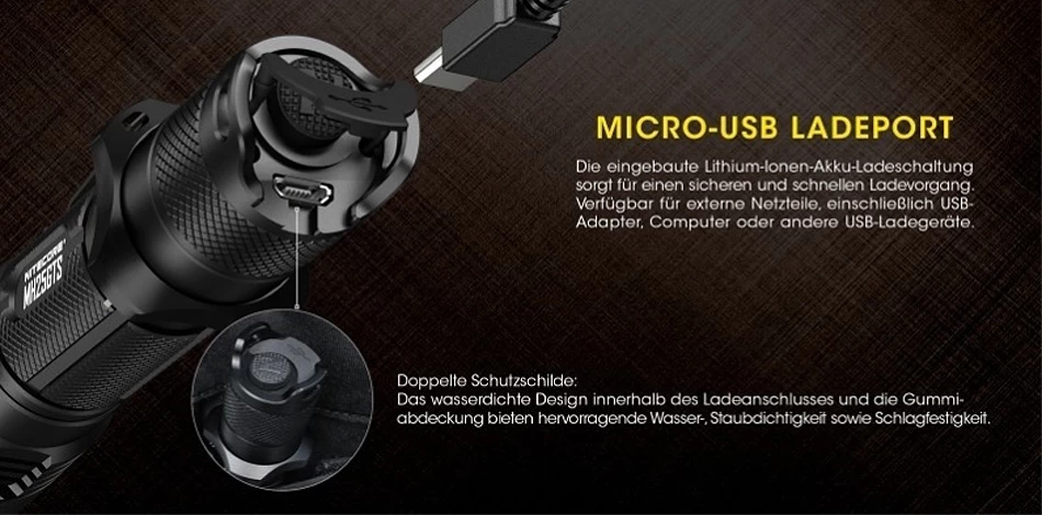 Die MH25GTS von Nitecore ist eine enorm leistungsstarke, trotzdem kompakte Lampe. Liegt mit ihrer Grösse gut in der Hand – gut zu handhaben auch mit Handschuhen. Integriertes Ladegerät, Hochleistungsakku und zahlreiches Zubehör im Lieferumfang. Der MICRO-USB-Ladeport ist in der Endkappe verbaut. Die Gummiabdeckung dient nur noch als Staubschutz, der USB-Port ist auch ohne Abdeckung wasserdicht. Das Design der Lampe ist auf taktischen Einsatz ausgelegt – so ist die Lampenkrone auf Einsatz als Glasbrecher und Schlagfläche bei Selbstverteidigung ausgelegt, der Strobe-Modus hat jetzt einen Random-Effekt: die wechselnde Frequenz des Blinklichts erhöht den Effekt der Desorientierung eines Angreifers.