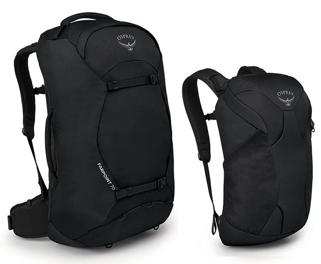 Klassischer groser Reiserucksack. Mit abnehmbarem Tagesrucksack. Bequemes Tragen durch volles Tragesystem, das hinter einer Klappe verschwindet, wenn es unsichtbar werden soll oder zur Sicherheit bei Verkehrsmitteln.