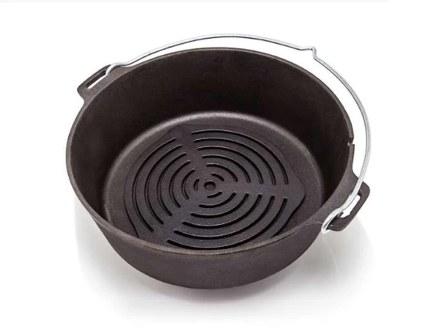 Dieser Einsatz für die Feuertöpfe ab Grösse 6 aus massivem Gusseisen schafft eine erstklassige Hitzeverteilung – genau richtig zum Backen im Feuertopf.