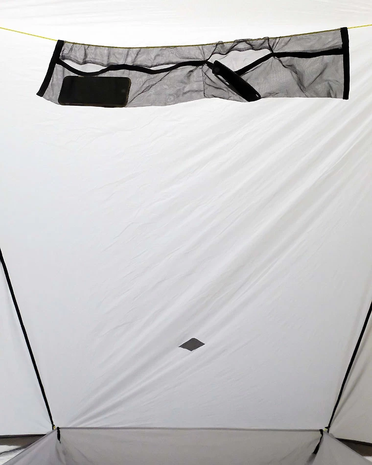- Der Schlafbereich ist so ausgerichtet, dass der nutzbare Raum, die Belüftung und die Aussicht maximiert werden. Eine Scheitelhöhe von 114 cm bietet Ihnen viel Kopffreiheit – sehen Sie auch die Maße in einem Detailbild. Bei gutem Wetter können Sie das Zelt mit noch mehr Kopffreiheit aufbauen.