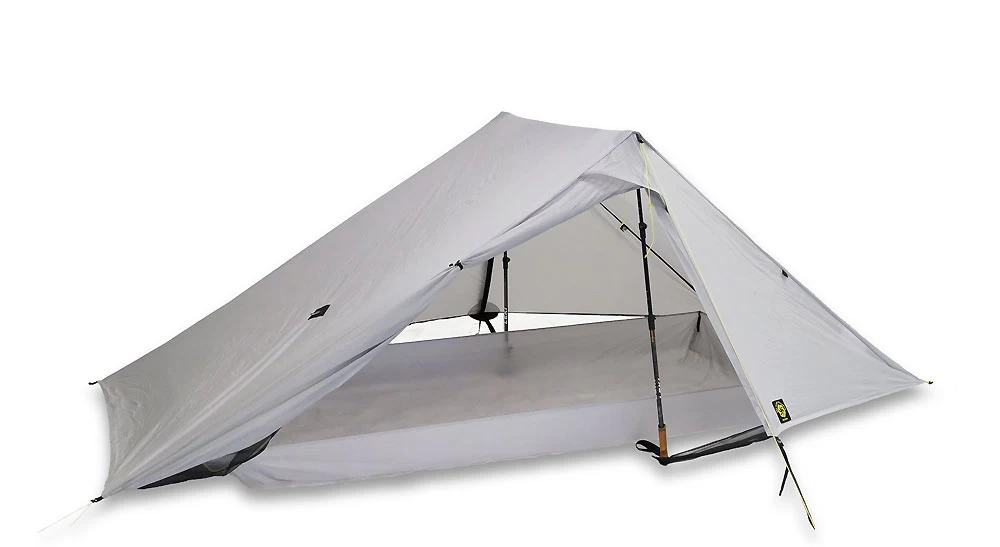 Eine sehr interessante Kombi aus tarp und Zelt – 690 g für ein Zwei-Personen-Tarp mit umlaufendem Moskitonetz und im Lieferumfang enthaltenem separatem Boden (zusätzlich 195 g) mit hochgezogenen Rändern (Wanne). Im Gegensatz zu den meisten sonstigen UL-Taprzelten braucht mensch hier nicht zusätzlich ein Moskitonetz mitzunehmen…